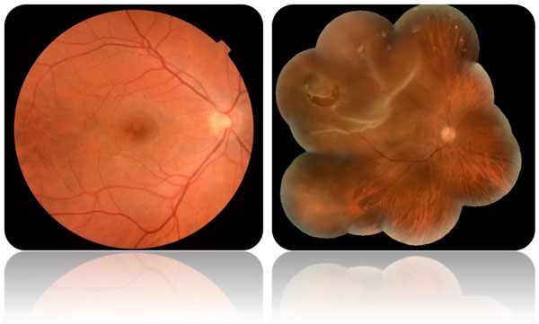 Şekil 1: Solda sağlıklı bir bireyin, sağda retina dekolmanı tanılı bir olgunun arka segment görünümü izlenmekte.
